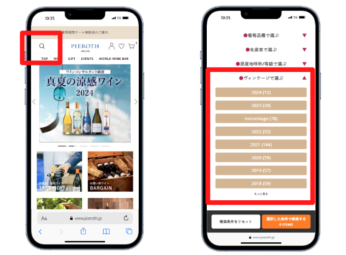 2. 開いた画面の下部にある「ヴィンテージで選ぶ」をタップし、指定の年のボタンをタップ