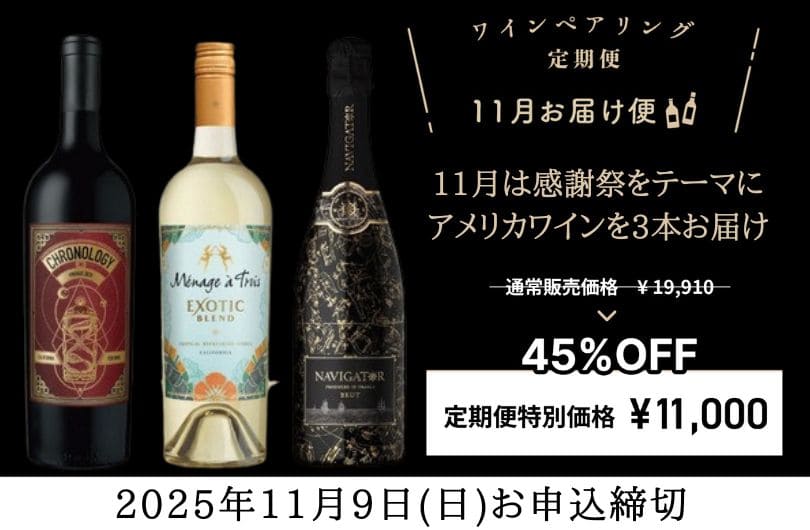 ワインペアリング定期便11月お届け便はメインディッシュに欠かせないターキーやアップルパイなど、アメリカの感謝祭でおなじみのメニューが登場。