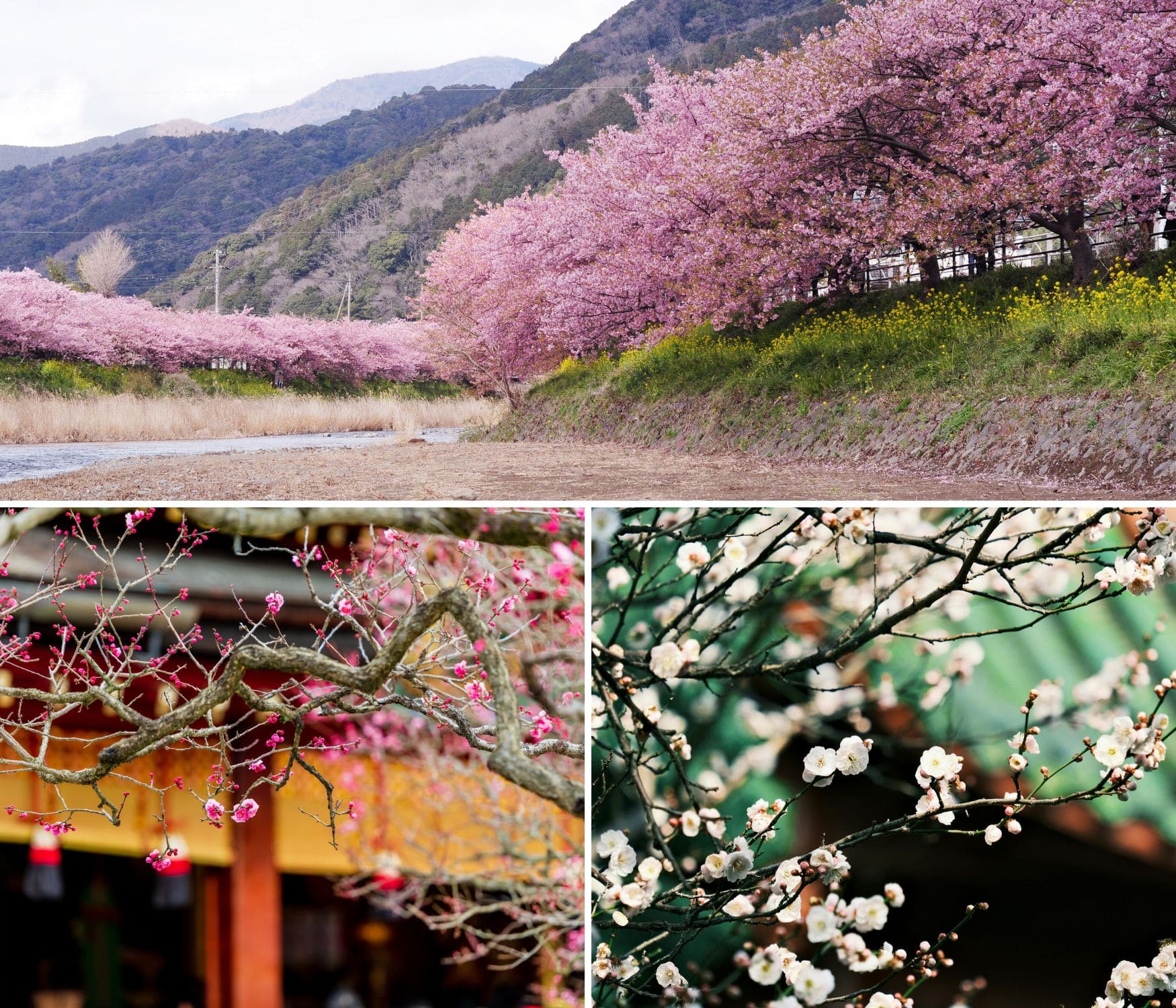 概要: 秋間川上流の山あいに広がる、関東有数の梅林。紅白の梅が山を彩ります。